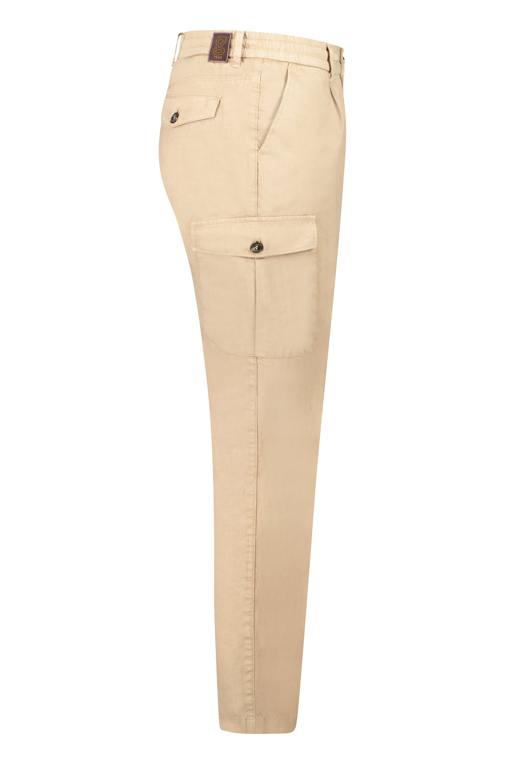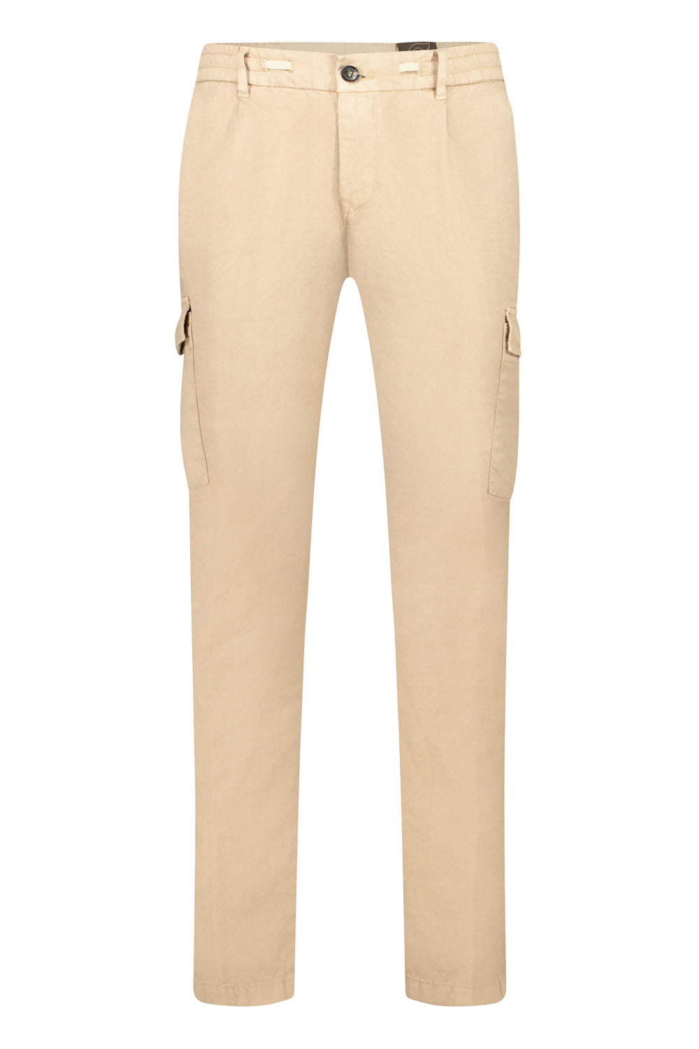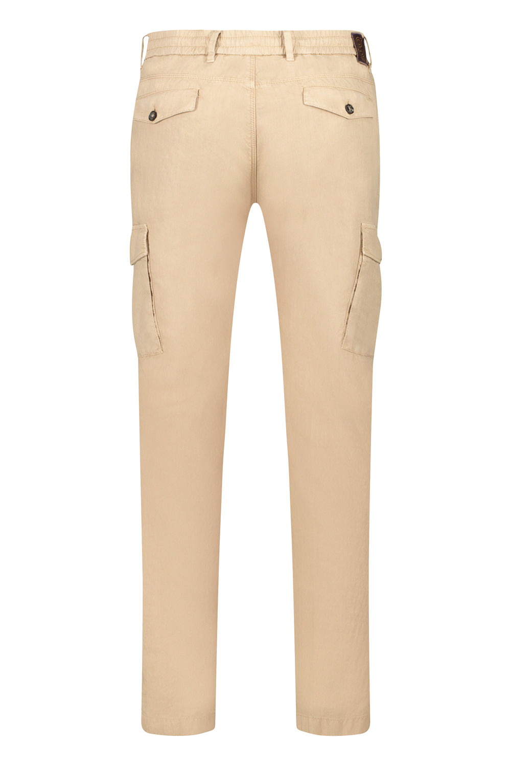 Sustainably cultivated linen from European growing regions vouches for top quality. Woven in Italy this material reaps the benefits of combining linen and cotton. The casual character of cotton and the breath- able, cooling properties of linen make for an exclusive wear comfort. Contemporary wearability comes care of the spandex admixture. A compact weave, the linen slubs and an elaborate garment-dye finish with “old” treatments give the fabric an unmistakeable character with quality vintage aesthetics. The fabric owes its charm to the irregular surface, the subtle faded effects along the seams and its crisp, masculine touch.