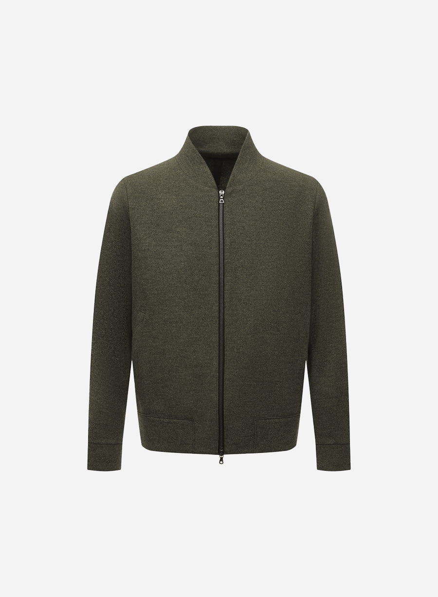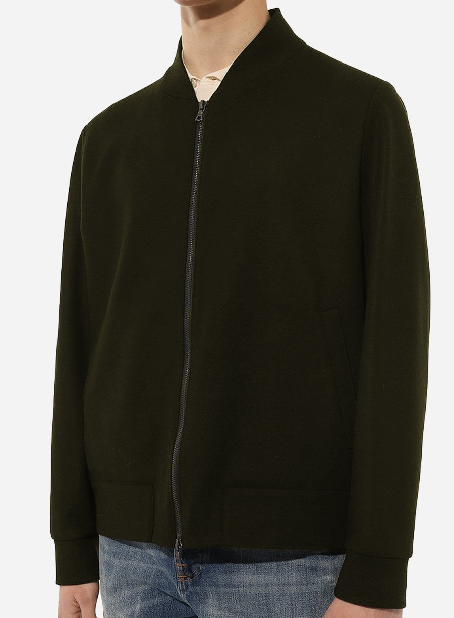 This bomber jacket, available in Black and Deep Green, is a perfect choice for cooler weather. Expertly crafted from soft wool with a tightly woven structure, it provides excellent wind resistance while maintaining a comfortable internal climate. A wide belt adds structure to the silhouette, and the jacket secures with a sleek counter zipper.