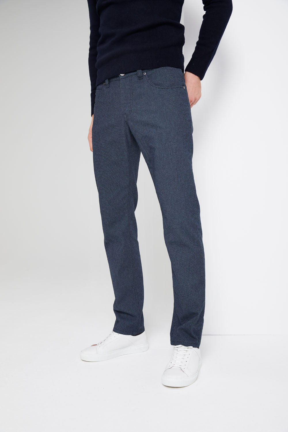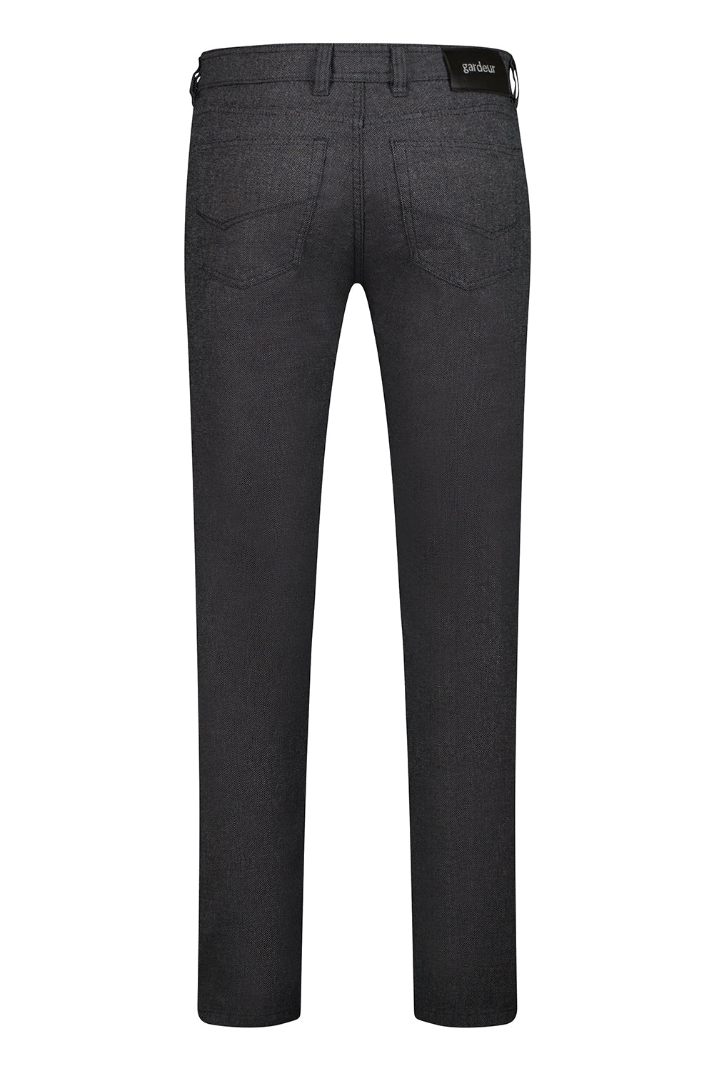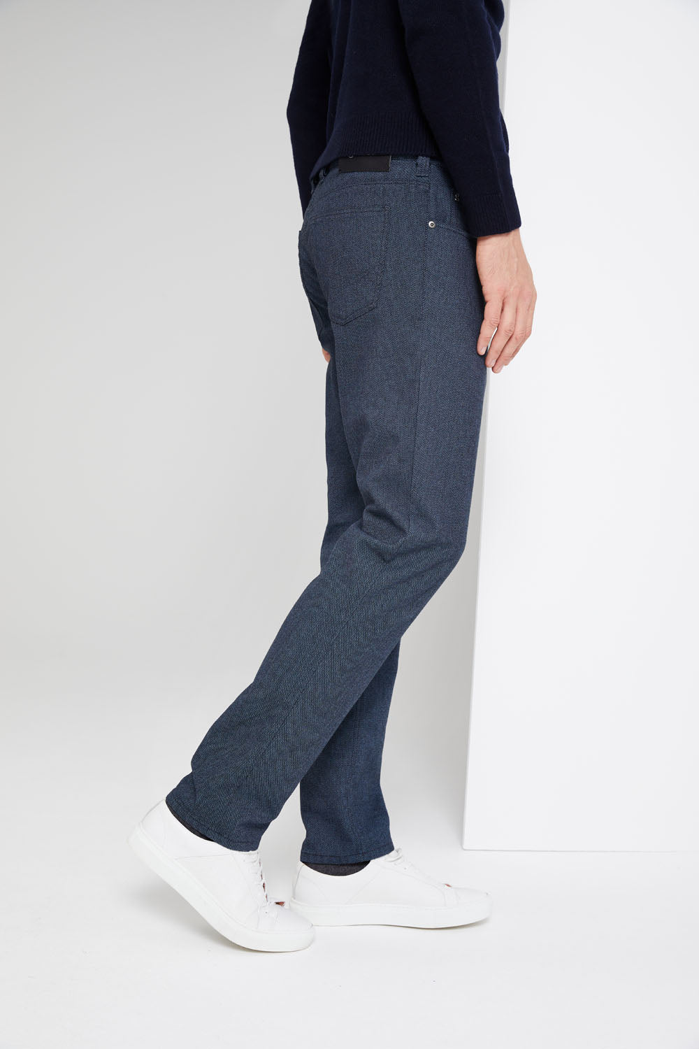 Here key factors from business and casual styling segments fuse in an informal and modern interpretation. The unmistakeable look reminiscent of a peacock feather comes care of the special weave construction and colour scheme used for this fabric with a sartorial appearance. The use of finest heathered yarns adds to the aristocratic wool look. The gently sanded surface and comfy stretch guarantee an exclusive touch and contemporary freedom of move- ment. A painstaking wash provides eWOOLution trousers with up-to-date casual aesthetics while preventing subsequent shrinkage after home laundering.