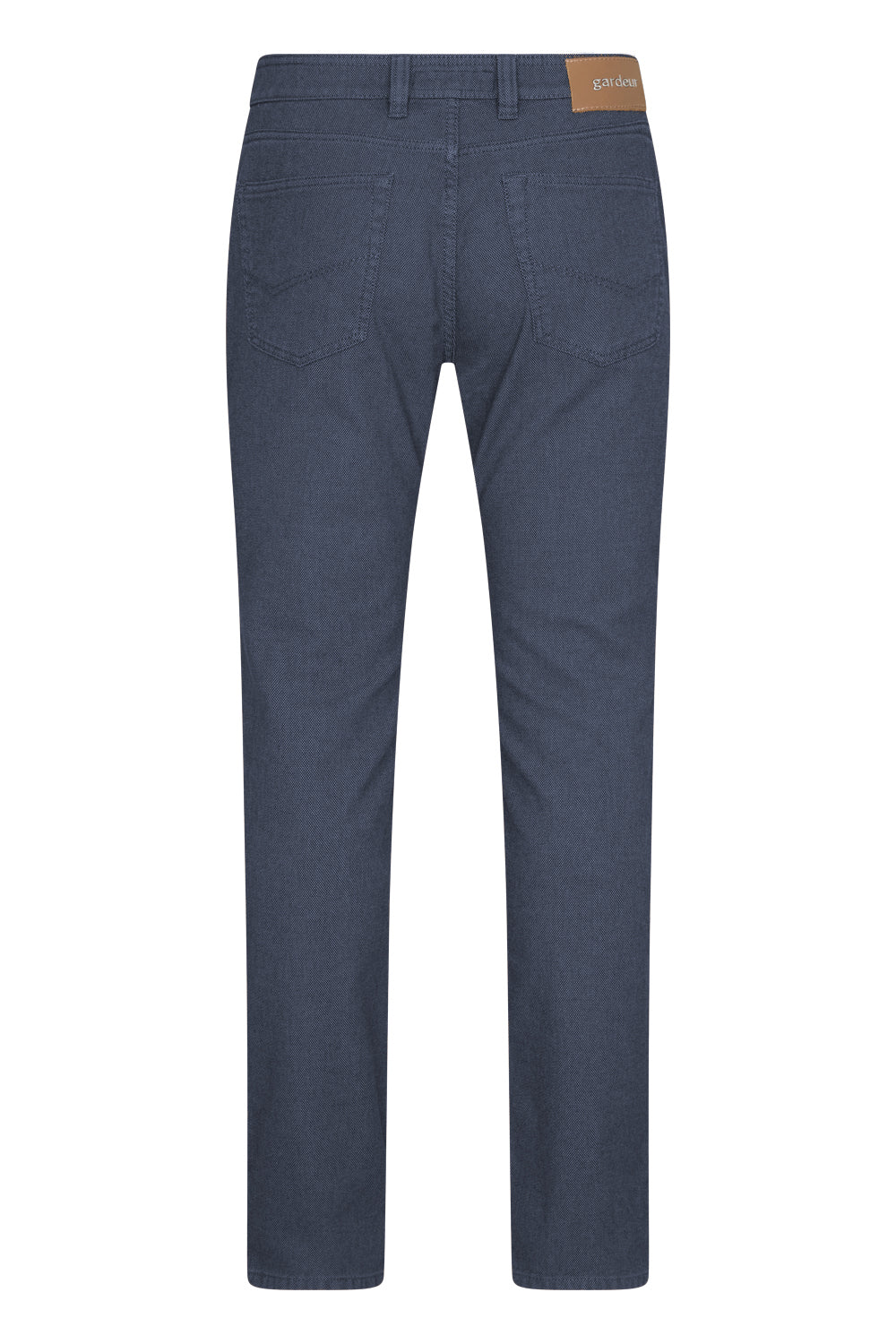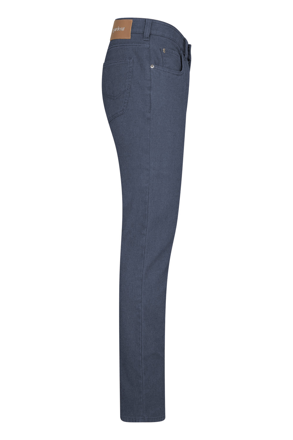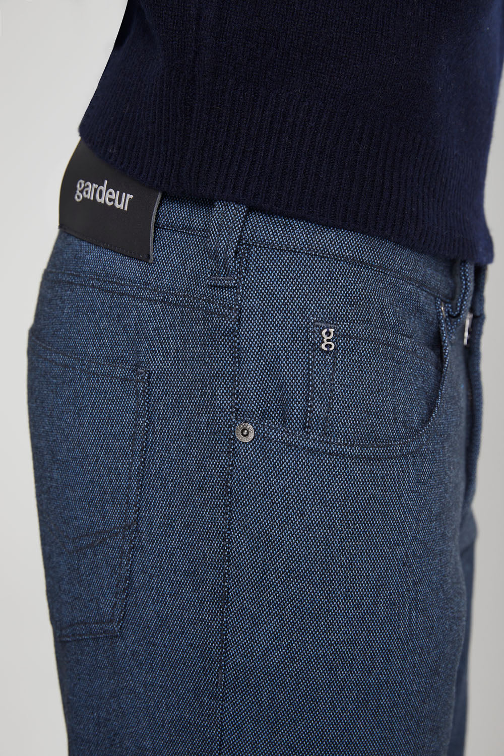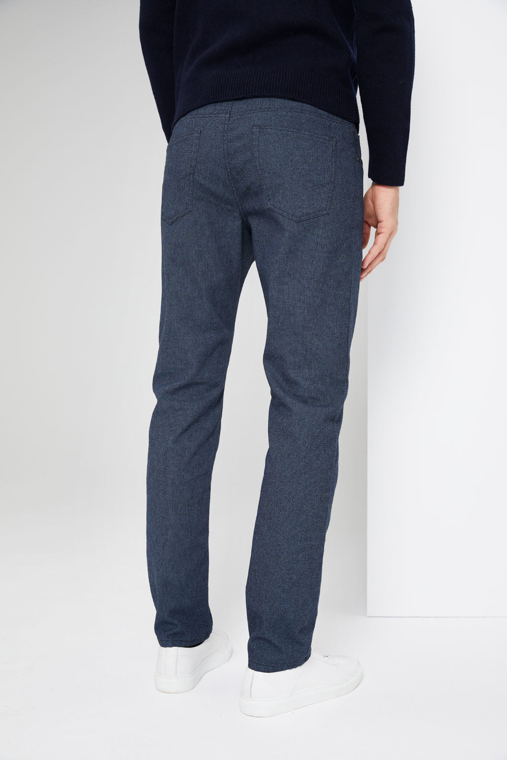 Here key factors from business and casual styling segments fuse in an informal and modern interpretation. The unmistakeable look reminiscent of a peacock feather comes care of the special weave construction and colour scheme used for this fabric with a sartorial appearance. The use of finest heathered yarns adds to the aristocratic wool look. The gently sanded surface and comfy stretch guarantee an exclusive touch and contemporary freedom of move- ment. A painstaking wash provides eWOOLution trousers with up-to-date casual aesthetics while preventing subsequent shrinkage after home laundering.