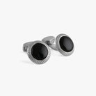 Our classic round cufflinks feature semi-precious stones and our signature diamond pattern. The perfect pairing for the ultimate business collection. Finished with rhodium plated base metal and black onyx semi-precious stones, commonly related with grounding and protection. The colour and natural formation of our gemstones differs from one another due to natural variation, making each piece truly one of a kind. The face of each cufflink measures 16mm length x 16mm height x 7mm width.